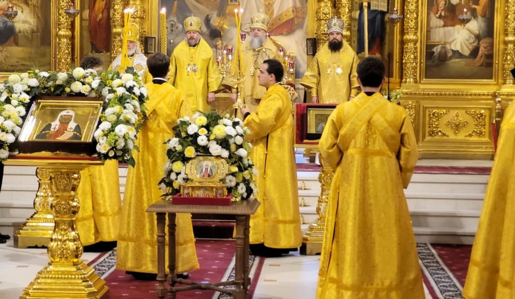 Обращение Святейшего Патриарха Кирилла в связи со 100-летием со дня преставления святителя Тихона огласил иеромонах Рафаил (Митрофанов). Песнопения богослужения исполнил хор собора под управлением протодиакона Владимира Зубрицкого.
