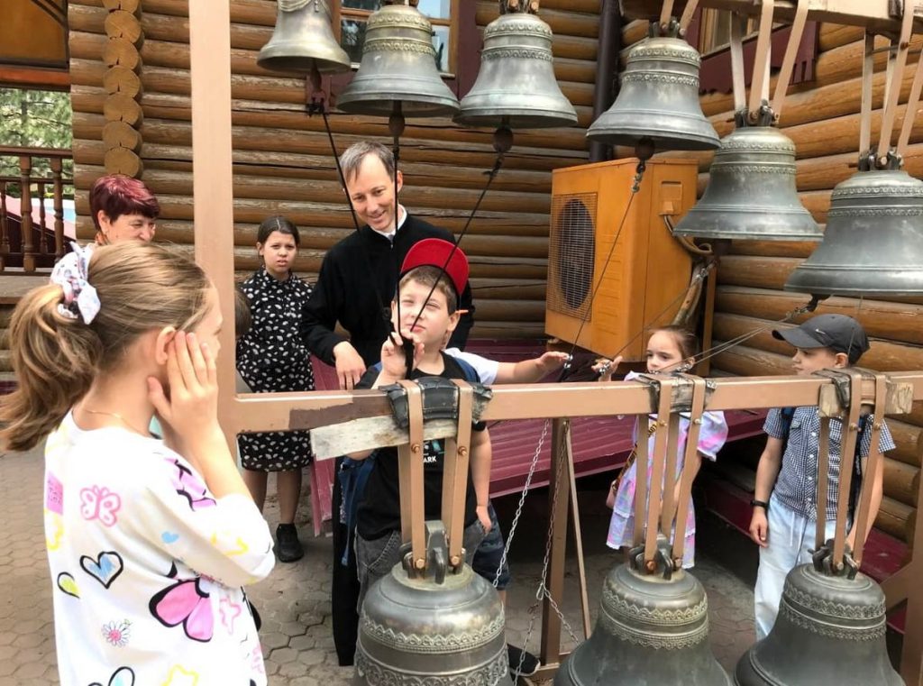 В завершение экскурсии у звонницы экскурсовод Сергей показал детям некоторые приёмы колокольного звона и дал им возможность попробовать свои силы в этом искусстве. На память о встрече он подарил участникам экскурсии книжные закладки с молитвами ко Господу и Богородице.