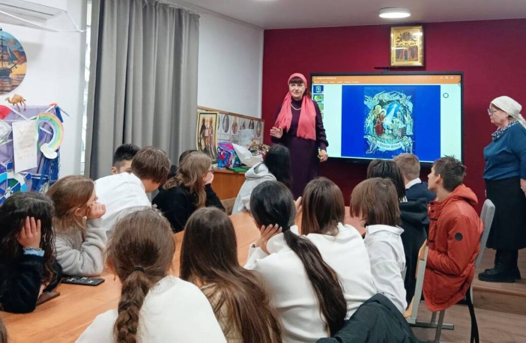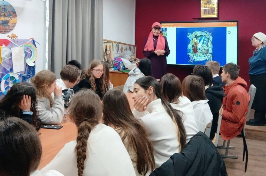 Представительницы сестричества пояснили, для чего Бог пришел в мир, стал Человеком. Они побеседовали с учащимися о важности молитвенного общения с Богом, рассказали о помощи Божией во время военной спецоперации.