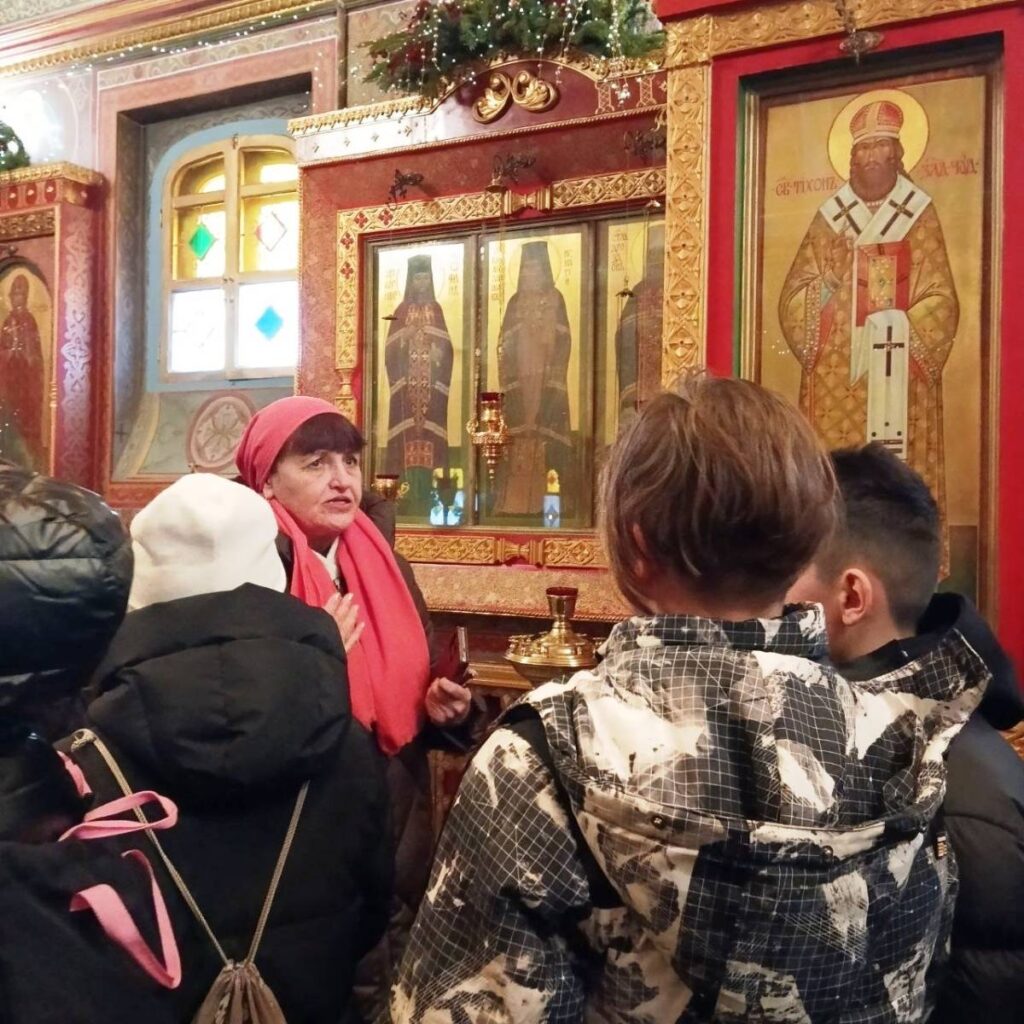 По благословению настоятеля прихода иерея Александра Фроленкова экскурсии для ребят провели сотрудницы сестричества. Они показали вертеп на подворье и украшенный нарядными ёлками, гирляндами и огоньками храм, рассказали о Рождестве Христовом, показали иконы праздника и фотографии Вифлеема.