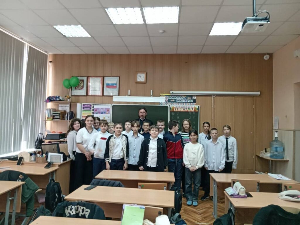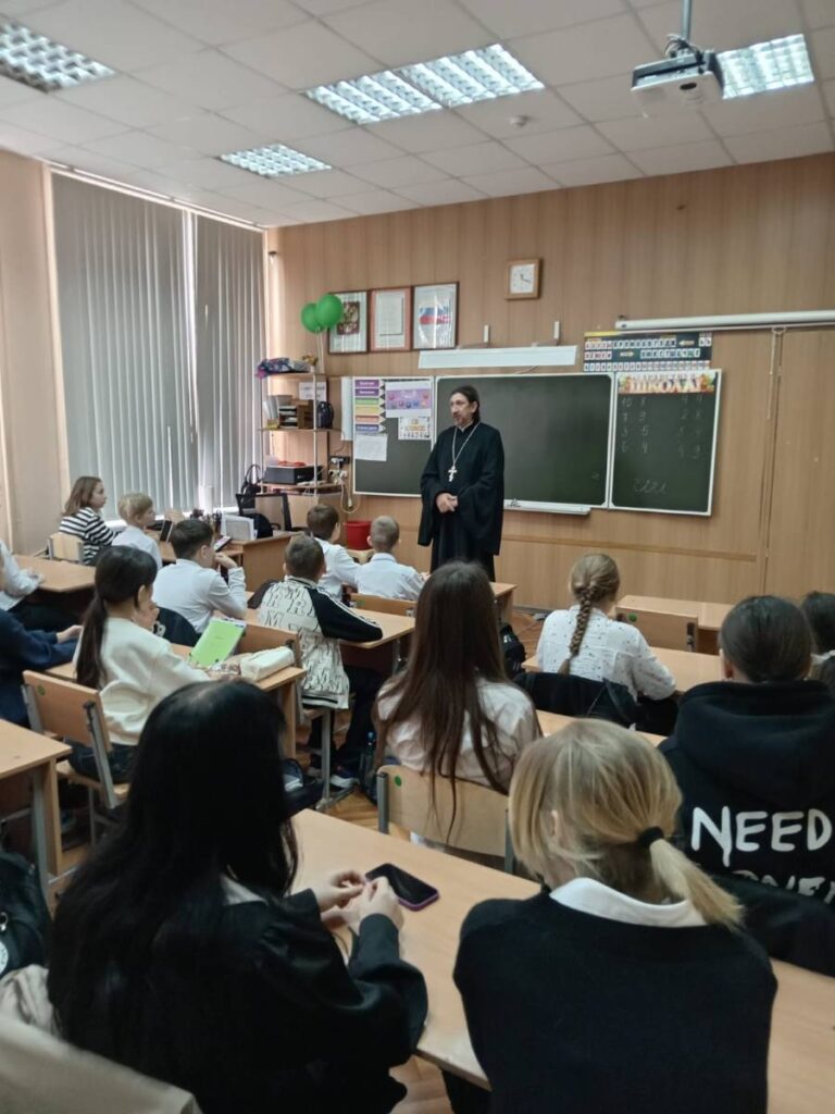 17 ноября 2025 г. в рамках сотрудничества Свято-Троицкого прихода г. Ростова-на-Дону и МБОУ «Школа № 67» клирик прихода иерей Александр Лиманов встретился со школьниками пятого класса. Он рассказал ребята историю возникновения праздника Покрова Пресвятой Богородицы, познакомил их с иконографическим изображением праздника. Из рассказа батюшки пятиклассник узнали и том, почему этот праздник так почитается в России и об известных иконах Богородицы. Кроме того объяснил детям почему, согласно Заповедям, необходимо почитать родителей и учителей.