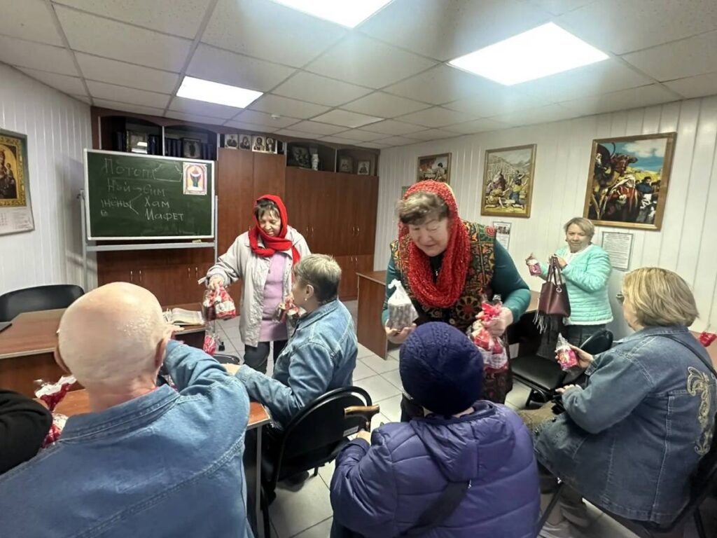 После окончания занятия ведущая кружка помощник настоятеля прихода по РОиК Лариса Дорохова и помощник благочинного Марина Подгородниченко от имени настоятеля и сотрудников прихода поздравили собравшихся с Пасхой Христовой и вручили им пасхальные куличи.
