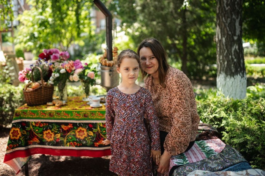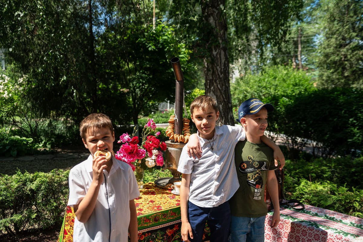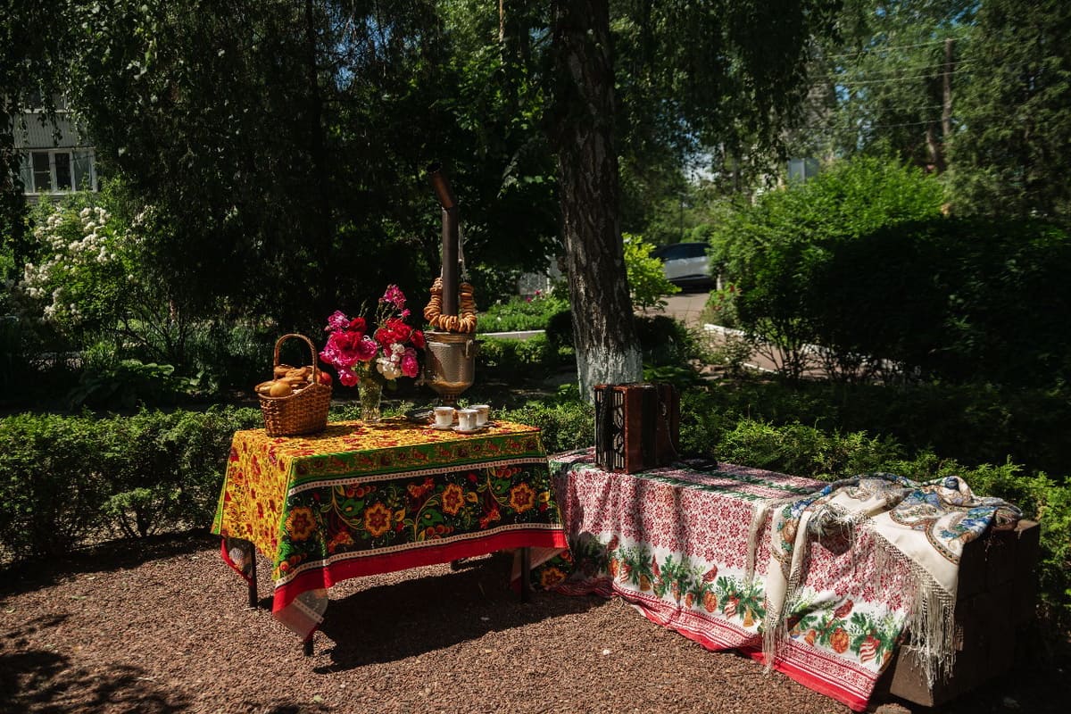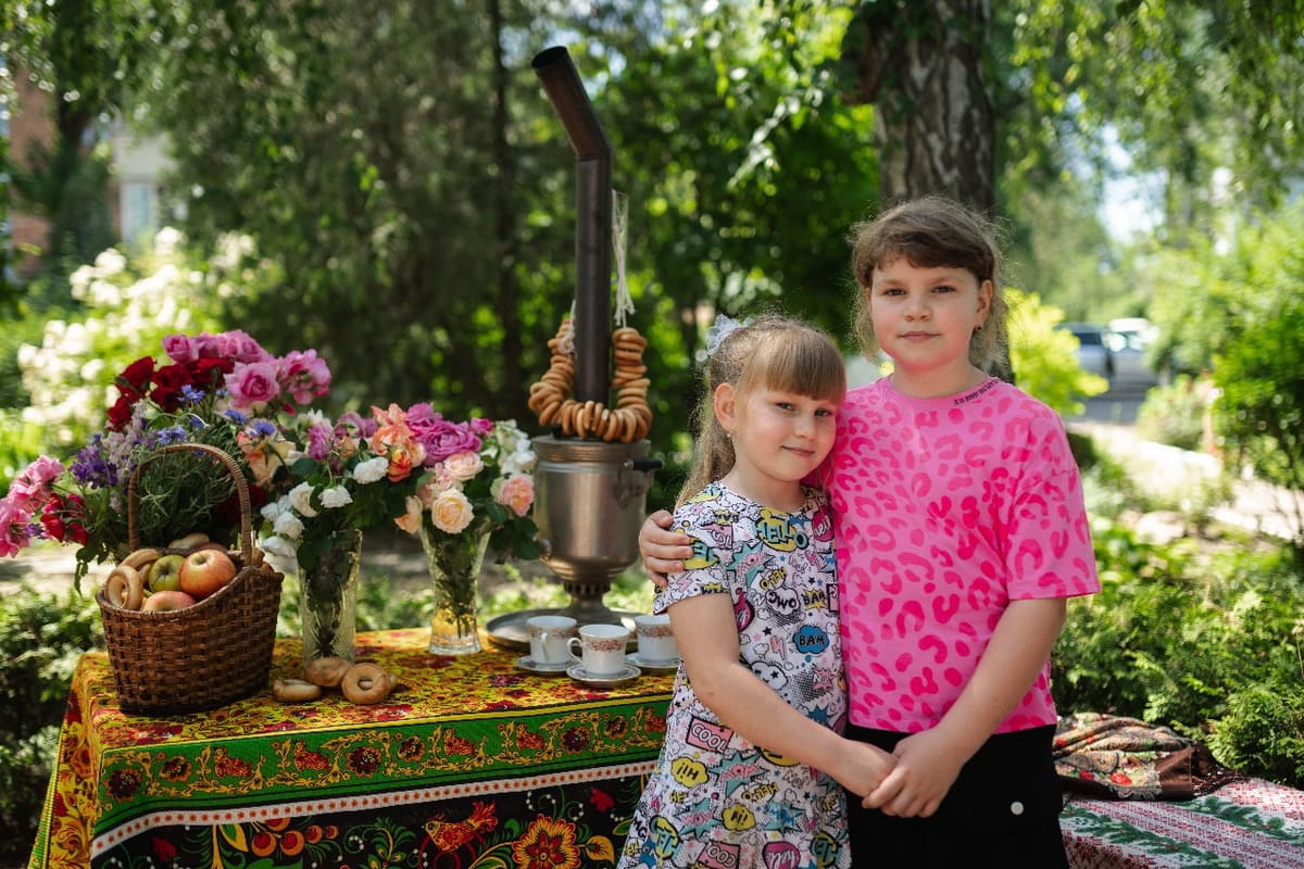 В саду при храме была создана фотозона в стиле русского чаепития, дополненная живописными букетами, собранными мамами воспитанников под руководством библиотечного специалиста. Ребята с удовольствием фотографировались в декорациях «русского чая».