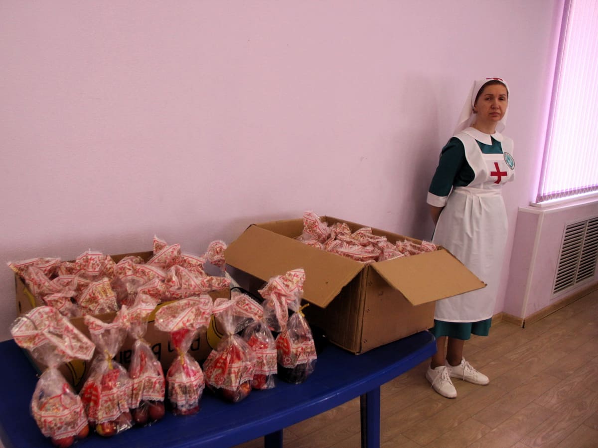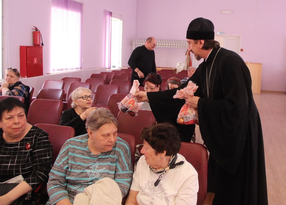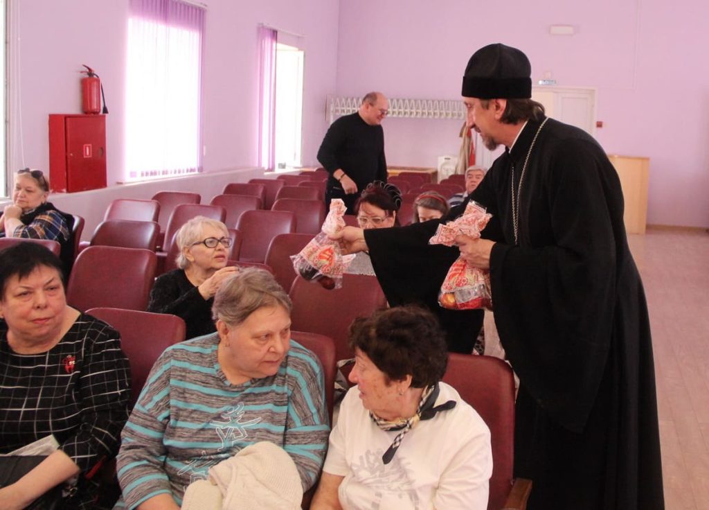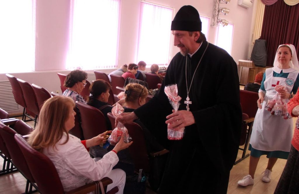 Клирик храма иерей Александр Лиманов, помощники благочинного Олег Голиченко и Марина Подгородниченко, и сестра милосердия Наталья Тохтамышева поздравили подопечных с Пасхой, вручили каждому сладкие пасхальные подарки и пожелали духовного и телесного здравия и помощи Божьей во всех делах.