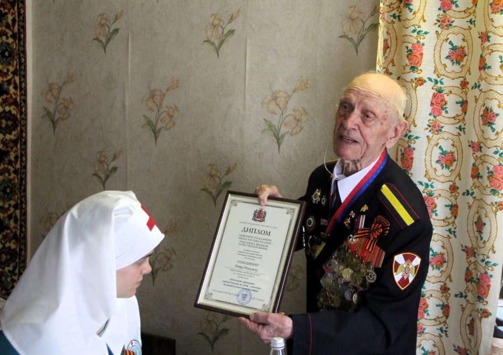 9 мая 2025 года, по благословению благочинного приходов Юго-Западного и Западного округов г. Ростова-на-Дону, настоятеля Свято-Троицкого прихода протоиерея Иоанна Осяка сотрудники Троицкого храма г. Ростова-на-Дону побывали в гостях у ветерана Великой Отечественной войны Голышкина Петра Павловича и поздравили его с 80-й годовщиной Победы в Великой Отечественной войне.