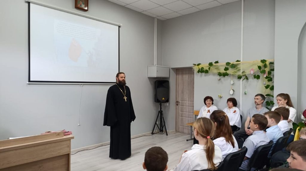После общей молитвы и минуты молчания к собравшимся ребятам обратился с приветственным словом настоятель храма иерей Александр Орешин. Священник поздравил всех присутствующих с праздником Воскресения Христова и грядущим восьмидесятилетием дня победы. Священник призвал слушателей хранить память предков и помнить об их великой жертве во имя мира на земле, особенно отметив тот факт, что русский солдат на полях сражений Великой отечественной войны исполнил слова Спасителя: «Нет больше той любви, аще кто положит душу свою за други своя…».